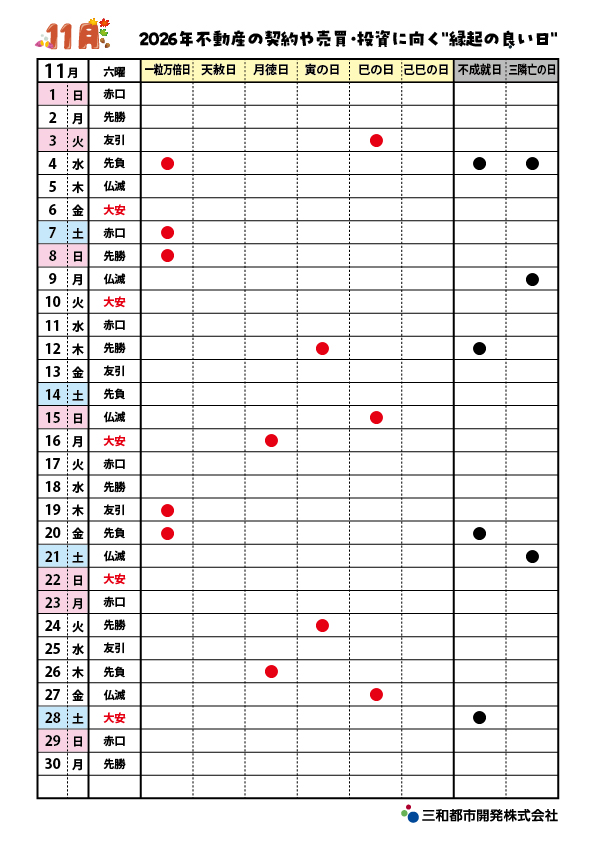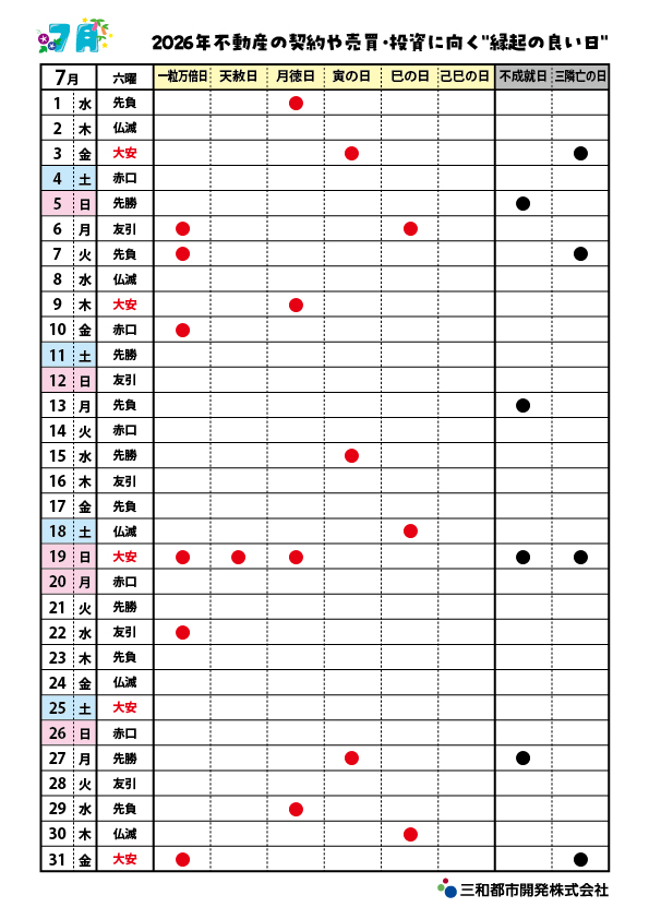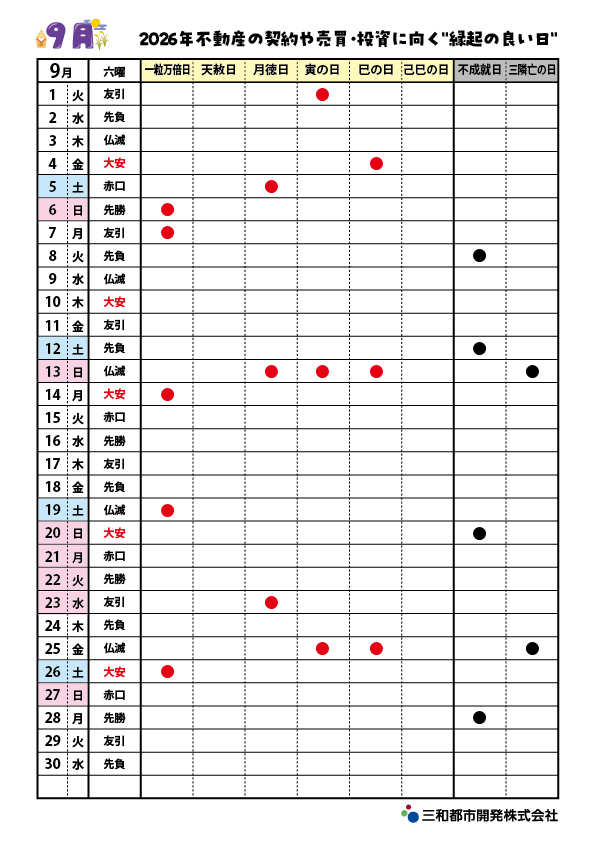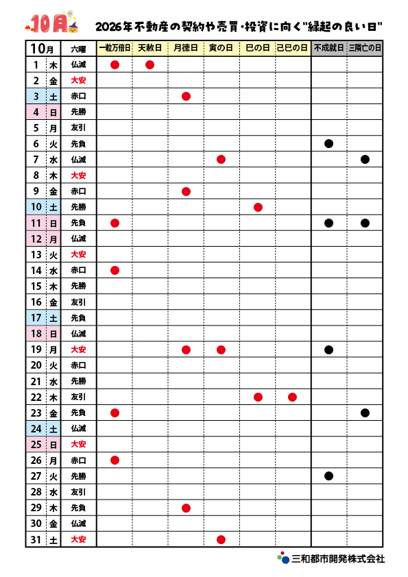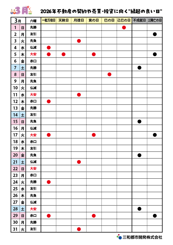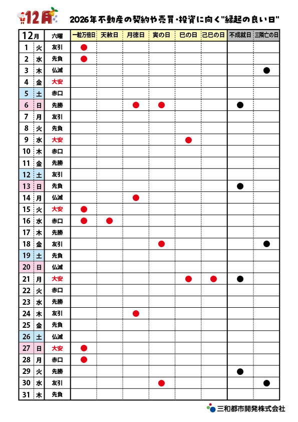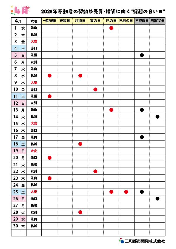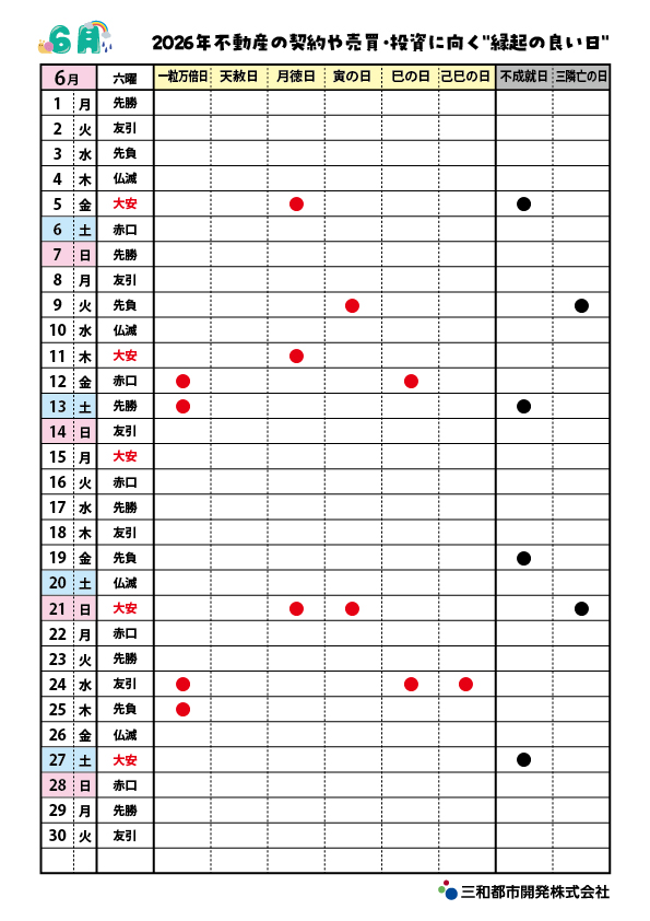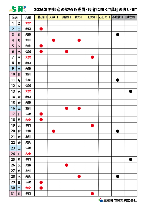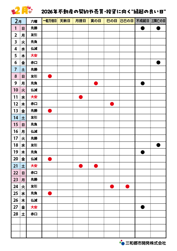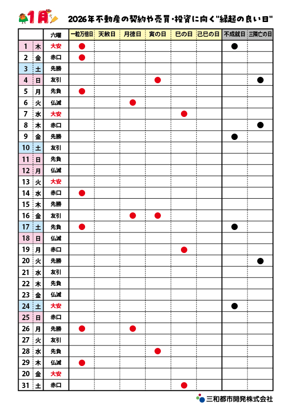 - 【一目瞭然】2026年版カレンダー!不動産の契約や投資に向く縁起の良い日